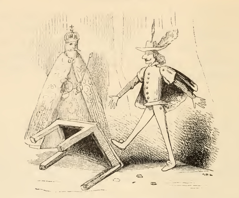 During master Peter's puppet show, an old man is pictured on the left with a crown on his head and a sceptre in his hand, meant to depict the emperor Charlemagne. The puppet on the right depicts Don Gaiferos' puppet, the son in law of emperor Charlemagne, who motions to walk off to the left of the castile. On the left a table lies on its side, having been flipped over, the remnants of a dice game lying on the floor.