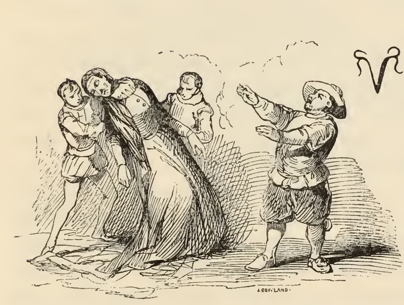 An older woman dressed in black robes (countess Trifaldi) faints away into the arms of two of her pages who catch her before she hits the ground. Meanwhile, on the right, Sancho Panza see's her faint away and lifting his arms denounces the punishment of the enchanter Malumbruno.