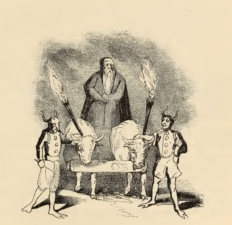 A waggons arrives in the forest, drawn by four oxen, all covered with black palls, and a large lighted torch of wax fastened to each horn. The drivers were two ugly devils,similarly habited in buckram, located on both sides of the oxen, each of whom grab the lighted torch from the oxen's horn. At the top of the waggon is fixed a seat, on which a venerable old man sits, with a white beard so long that it reaches below his girdle. He wears a long gown of black buckram. This is the sage Lirgandeo.