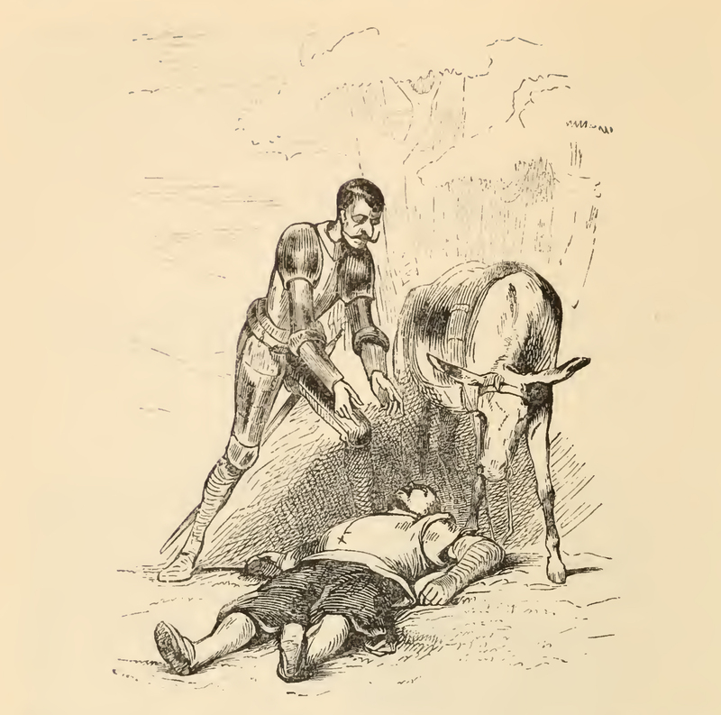 Having caught up with his master, Sancho Panza (middle) fell from his donkey at the feet of Don Quixote (left), wounded, bruised, and out of breath, his body limp and his arms by his side. Don Quixote, clad in armor, reaches down to examine his wounds. To the right, Dapple bends down to get closer to Sancho.