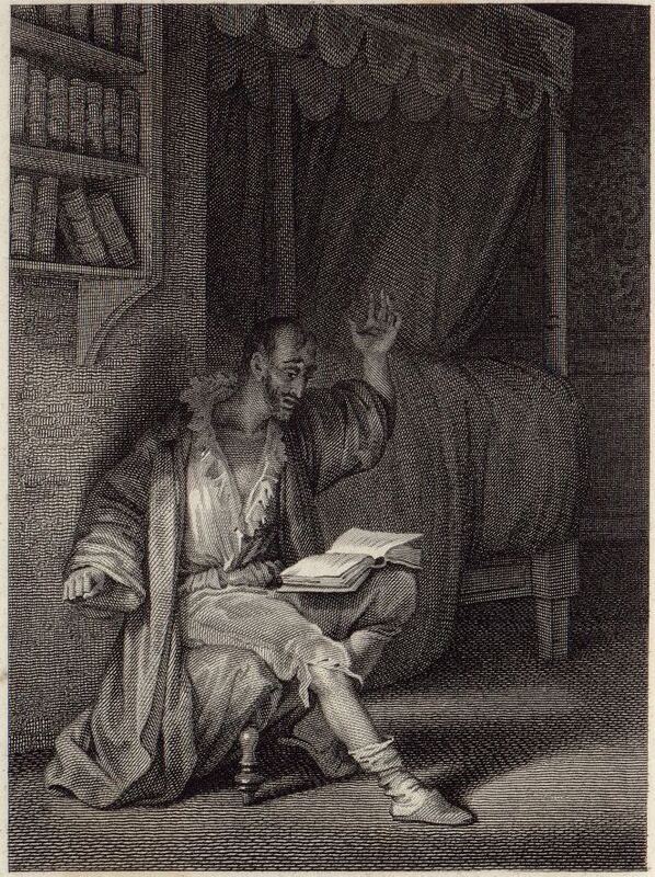 Alonso Quijana reads chivalric books in his library, slowly descending into madness (and becoming Don Quixote). Signed by E. Vernet (illustrator) and E. Lignon (engraver). Part 1, ch. 1.