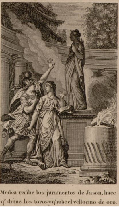 This image depicts Medea, the daughter of King Aeetes, looking passionately at Jason, the leader of the Argonauts. Jason is on a mission to retrieve the Golden Fleece, which King Aeetes currently has. King Aeetes has given Jason a challenge to complete in order to receive the Golden Fleece from him. Medea is completely infatuated with Jason and decides that she will betray her father in order to help him. In return for Medea’s assistance, Jason promises to marry her. Jason and Medea are depicted standing at a temple dedicated to Hecate. There is a large statue of Hecate in this image with a burning fire directly beside it.