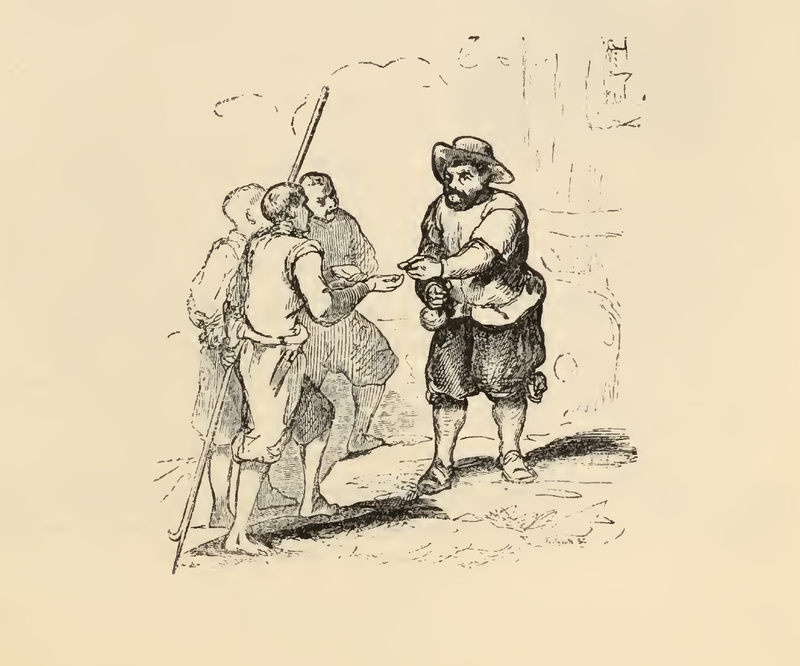 Having destroyed the fishing boat, two fishermen seek reparations. At the order of Quixote, Sancho compounds the fishermen, and pays them gold reals for the boat, which Sancho disbursed into the cupped hands of the fishermen who walk barefoot. The man in between the two fishermen holds a wooden pole in his hand.