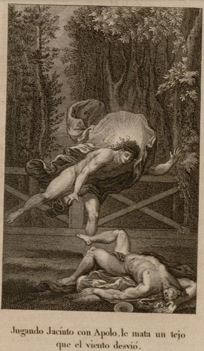 This image depicts the love story and tragedy of the god Apollo and his lover Hyacinthus. The two would often engage in physical activities together, and one day they decided to have a disc throwing contest. Apollo threw the discus, which cut through the heavens and the skies. As it was falling back to Earth, Hyacinthus wanted to impress Apollo by catching it, however, he got too close as it hit the ground. When the discus rebounded off the ground, it fatally hit Hyacinthus in the head. Apollo is running over to his lover who is lying dead on the ground. In order to be with Hyacinthus forever, he transforms him into the Hyacinth flower, which blooms every year.