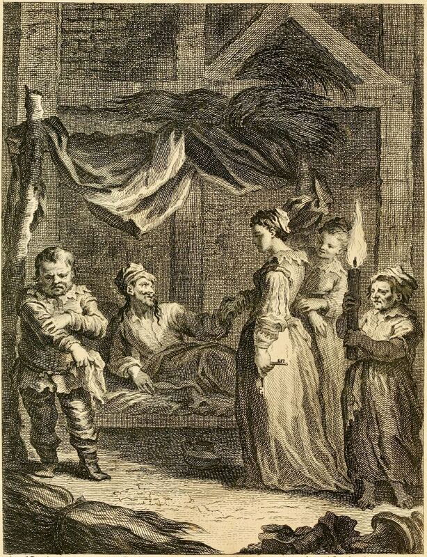 The innkeeper (holding Don Quixote’s hand), her daughter (behind her mother), and Maritornes (holding the torch) take care of Don Quixote and make him a bed in the garret. Sancho Panza is pictured holding his arm with an expression of pain. Plate no. 10, signed by J. Vanderbank (illustrator) and G. van der Gucht (engraver). Vol. 1, book 3, ch. 2.