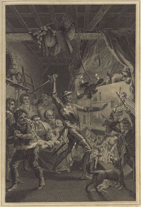 Don Quixote attacks the puppets while several astonished theatregoers and Maese Pedro watch him. Details of the illustration are accurate to Cervantes’ text: Maese’s eyepatch and monkey without tail. Signed by C. Armstrong (engraver). Part 2, ch. 26.