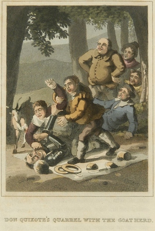 The goatherd ridicules Don Quixote, starting a fight. The knight seizes a loaf a bread from the table and hits the goatherd in the face. Sancho Panza disrupts the fight and prevents the goatherd from choking Don Quixote. The priest and the officers of the Holy Brotherhood look on. Unsigned. Part 1, ch. 3.