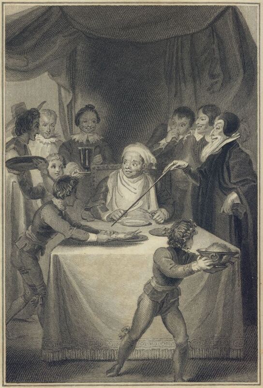 Sancho Panza is taken from the courtroom to a sumptuous palace, where, in a large hall, a royal table is set. Plates of food are placed before Sancho, but at the request of the physician Pedro Recio (right, holding a rod), they are taken away. Signed by T. Stothard (illustrator) and J. Fittler (engraver). Part 2, ch. 47.