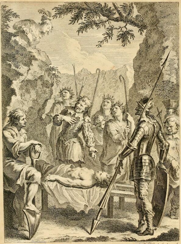 Marcela appears on a crag overlooking Grisóstomo’s burial (centre of the composition). Ambrosio, Grisóstomo’s friend, stands near his body, gesturing toward it. He accuses Marcela of causing the death. The narrative diagonal joins these three characters: from Marcela, through Ambrosio’s arm, to Grisóstomo. The figures of a gravedigger to the left and Don Quixote to the right form two verticals to balance the diagonal. The scene is observed by Sancho Panza and several goatherds. Plate no. 9, signed by J. Vanderbank (illustrator) and G. van der Gucht (engraver). Vol. 1, book 2, ch. 6.