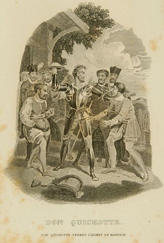 Don Quixote holds the Mambrino’s helmet (the barber’s basin) aloft while trying to make peace between Sancho Panza and the barber. The latter are fighting over the packsaddle, which is pictured on the ground between them. A crowd, including Don Fernando, the barber Nicolás, and the priest, watches. Unsigned. Part 1, ch. 45.