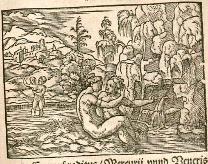 This engraving illustrates the story of Hermaphroditus and Salmacis. Salmacis is a water nymph that occupies a pool of fresh water and falls in love with Hermaphroditus when he finds her pool. The pool is illustrated behind the pair who are depicted at the forefront of the engraving. Hermaphroditus is the son of Mercury and Venus, and the beauty of his appearance captivates the Naiad. She is overcome with passion and cannot restrain herself from pursuing Hermaphroditus despite his rejection of her. Salmacis, with her arms thrown around Hermaphroditus’ neck, asks the gods to never be separated from him. The gods oblige and merge their two bodies together, creating the first Hermaphrodite. They are depicted as one body in the background of the engraving standing in the pool.
