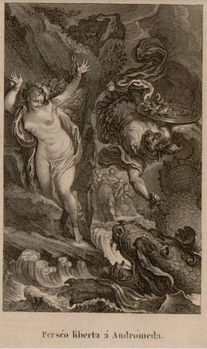 This image depicts Andromeda, the daughter of King Cephus, chained to a rock amidst the sea. Andromeda was placed here to pay the penalty for something her mother had said. Perseus had been flying in the sky when he happened upon this scene and spotted the beauty of Andromeda. Perseus asked Andromeda who she was and where she came from, yet, before she could finish speaking, a great serpent had emerged from the sea. Andromeda’s parents agreed that they would allow Perseus to take Andromeda’s hand in marriage in exchange for killing the serpent and saving their daughter. Perseus is depicted coming down from the sky and piercing the chest of the serpent on the right side of the image.