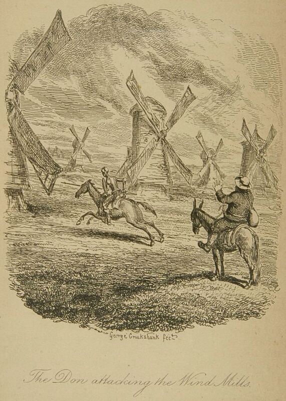 Don Quixote, mounted on Rocinante, charges the windmills, which he mistakes for giants. Sancho Panza tries to warn him in vain. Signed by G. Cruikshank (illustrator and engraver). Part 1, ch. 8.