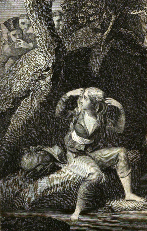Dorotea sits on a rock, dipping her right foot and wiping her hair with water from the rivulet having rolled up her pants and let her hair down. She looks over her shoulder thinking herself watched. On the left by her side sit a pair of shoes, a bag filled with her belongings and a hat. In the top left, the priest covers his mouth in thought, the barber looks down at the girl with a walking stick in hand, and Cardenio's face can be seen on the right side of the tree.
