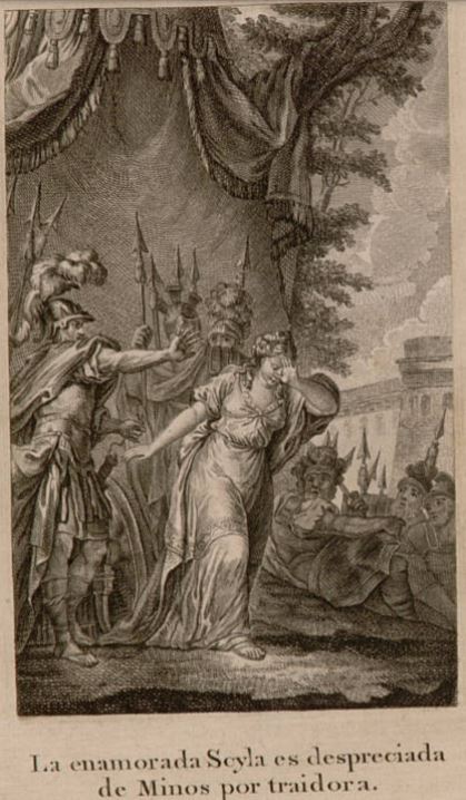 This engraving depicts Scylla, the daughter of King Nisus of Megara, betraying her father by helping King Minos of Crete. While King Minos had been attacking the city of Megara, Scylla had fallen in love with him while watching the battles from afar. She decided her love for King Minos was worth betraying her father and her city, so she cut off a piece of her father’s magical purple hair which kept him safe from harm and handed it over to King Minos. Although King Minos was the enemy of Megara, he found Scylla’s actions deplorable. This image depicts King Minos putting his hand in Scylla’s face as he wants nothing to do with her. Scylla is turning away from Minos and covering her face in shame. Many of Minos’ soldiers are depicted watching the event unfold.