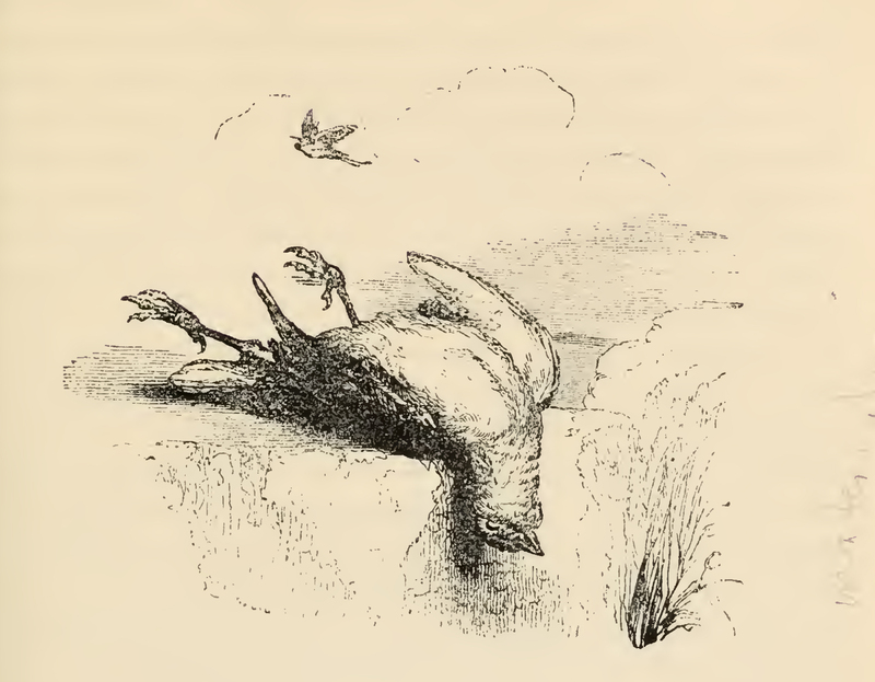 The body of a dead sparrow lies upon the ground, its head hanging over a ledge, its feet loft and poised, wings folded by its side. In the background a bird flies in the sky. The image is evoked by Don Quixote saying "Verily, verily, a sparrow in the hand is better than a vulture upon the wing".