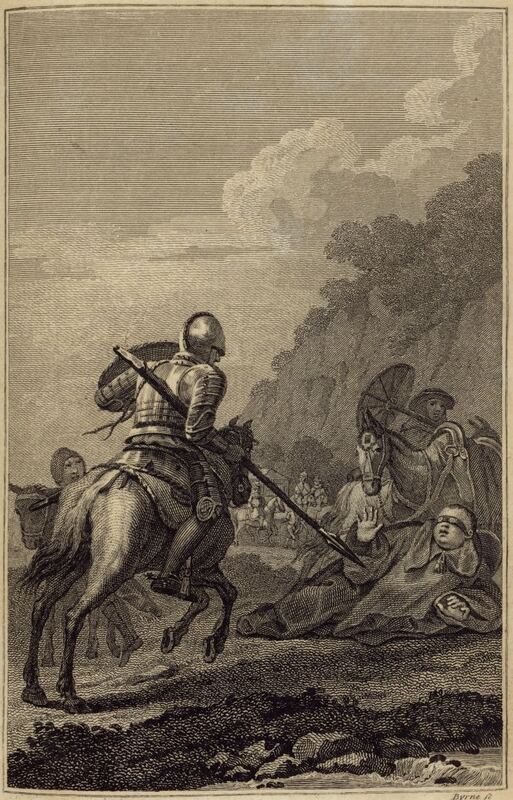Don Quixote attacks one of the friars of Saint Benedict, who has fallen from his mule. Sancho Panza and another friar with a parasol are also pictured. In the background, the Basque lady’s carriage. Signed by W. Byrne (engraver). Part 1, ch. 8.