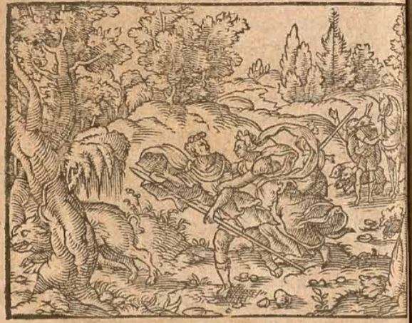 This engraving illustrates Picus, the King of Latium, chasing after a boar during a hunt. While on his hunt, the goddess Circe had caught sight of Picus and fell in love with him. He had been riding on his horse (illustrated in the background with his companions) and she could not catch up to him. Circe had conjured up an illusion of a pig which ran into the woods, which resulted in Picus getting off his horse to chase after it. The boar is pictured on the left-hand side of the engraving, running into the trees. Circe is depicted with her arms around Picus as she confesses her love to him. Unfortunately for Circe, Picus was in love with a nymph named Canens, and rejected her advances. She ends up transforming Picus into a woodpecker and turns his companions into animals.