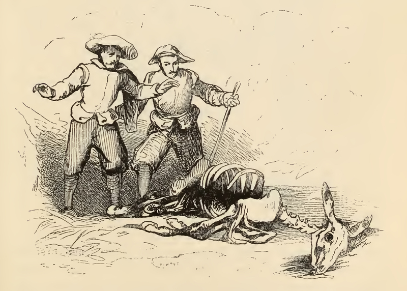 Two regidor's walk through a path in the wood and find the skeletal carcass of a mule, stripped clean and devoured of all meat by wolves. The regidor on the right carries a walking stick.