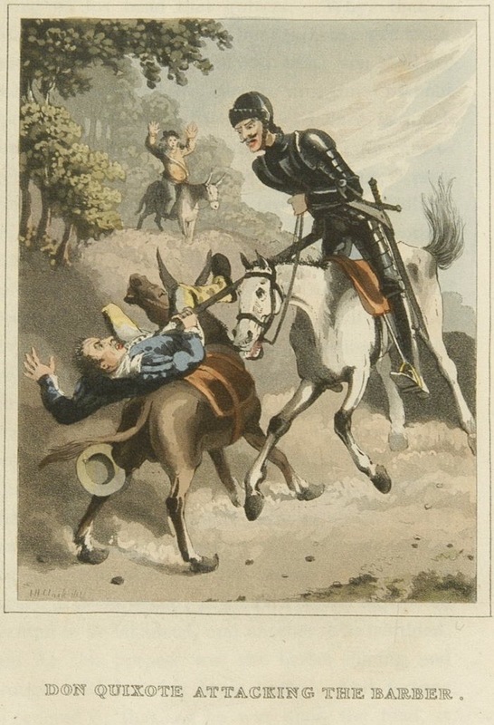 Mistaking a basin for what he believes to Mambrino’s legendary helmet, Don Quixote attacks the barber, who falls from his mount. In the background, Sancho throws up his arms. Unsigned. Part 1, ch. 3.