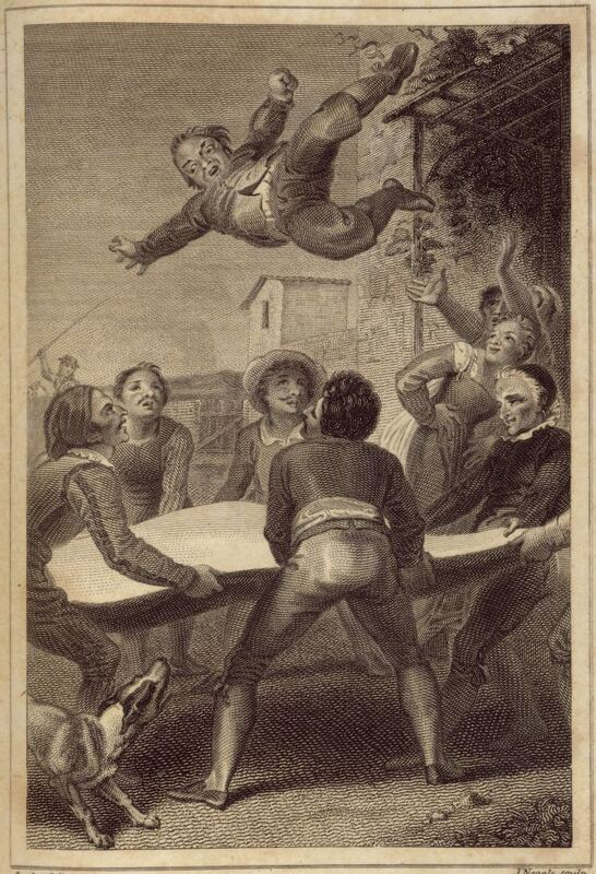 In the foreground, guests at the inn toss Sancho Panza into the air with a blanket when he refuses to pay the innkeeper. Among the guests are four wool carders from Segovia, three needlemakers from El Potro in Córdoba, and two residents of La Feria in Sevilla. In the background, Don Quixote stands on Rocinante so that he can see over the wall of the inn. Signed by T. Stothard (illustrator) and J. Neagle (engraver). Part 1, ch. 17.