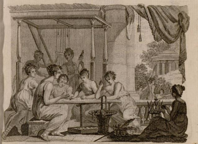 This image appears in the introduction of this volume. It depicts the Minyads (also spelled as Minyades), the daughters of King Minyas, who are telling stories to one another. While festivities were being held in worship for the god Bacchus, the Minyads decided to stay home and not take part in the festivals and told stories instead. As punishment for the lack of worship, Bacchus turns them into bats. The sisters are depicted sitting around a table and looking at one another as they recount their stories.