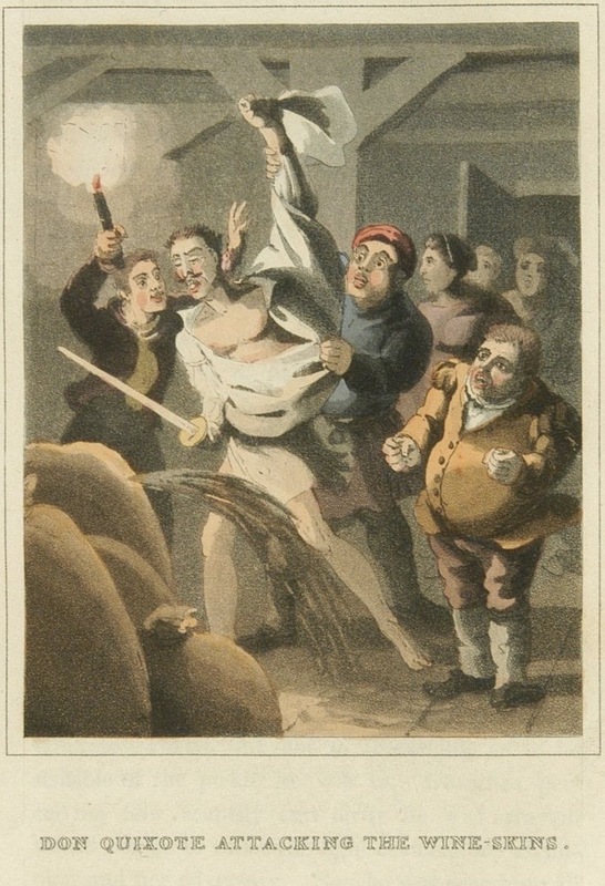 Don Quixote attacks the wineskins while sleepwalking. He is half-dressed, has a blanket draped over his right arm, and wields his sword. The innkeeper grabs him by the shoulder and clenches his fist, preparing to hit Don Quixote. The wine from a punctured wineskin spills onto the floor in the foreground. The barber, the priest, Sancho Panza, and Dorotea are also pictured. Unsigned. Part 1, ch. 3.