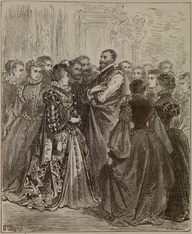At the soirée, Don Quixote dances with Don Antonio Moreno’s wife and some of her friends. Signed by G. Doré (illustrator) and H.-J. Pisan (engraver). Part 2, ch. 62.