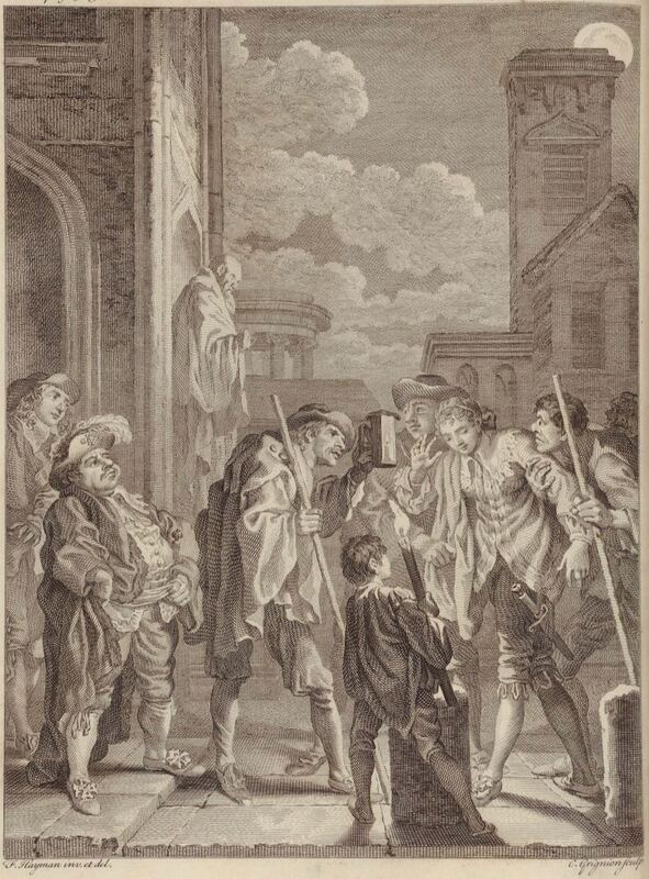 During his night round in Barataria Island, Sancho Panza discovers don Diego de la Llana’s daughter disguised as a man. The scene is illuminated by a soldier holding a lantern and a boy holding a torch. Signed by F. Hayman (illustrator) and C. Grignion I (engraver). Part 2, ch. 49.