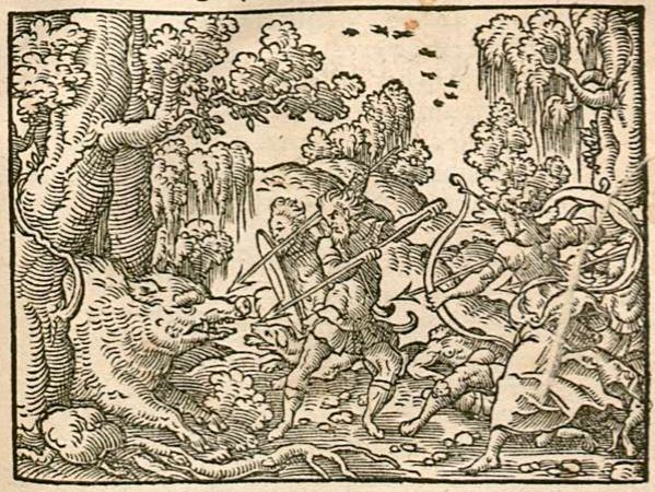The goddess Diana had become enraged that the citizens of Sicily had given sacrificial offerings to Minerva, Bacchus, and Ceres without including her. To exact revenge on the citizens, Diana sends a massive boar to terrorize the city. King Cocalus of Sicily sought the help of heroes Meleager, Theseus, Jason of the Argonauts, and Atlanta, a famous huntress. Atlanta is depicted in the engraving with her bow drawn pointing at the boar, with two other men beside her, one of them most likely being Meleager. Atlanta ends up shooting the boar in the ear, and Meleager finishes it off.