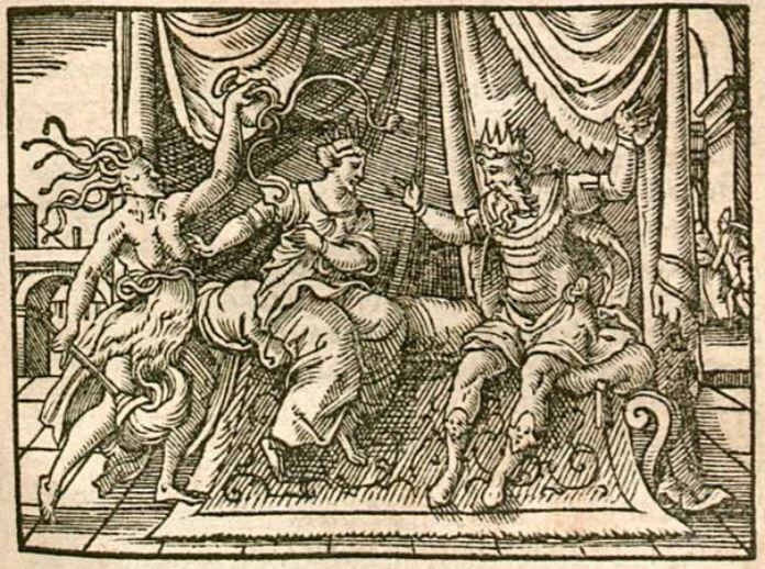 This engraving illustrates Ino and King Athamas sitting on their thrones while ruling over Thebes. One out of the three Furies, Tisiphone, is depicted on the left side of the illustration with snakes in her hair and a blood-soaked torch in her right hand. Her left hand is lifted above Ino and Athamas as she pours poisonous liquids over them. These liquids poison their minds and makes them crazy. Tisiphone was sent to do this by the vengeful goddess Juno.