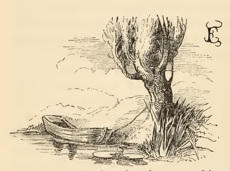 a small boat, without oars or any sort of tackle is tied to the trunk of a tree which grew on the brink of the river. In the river there are two lily pads and a growth of reeds on the right.