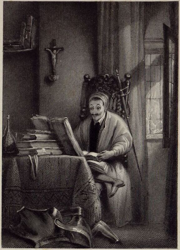 Alonso Quijana reads chivalric books in his library, slowly descending into madness. His arms and armour are strewn about on the floor. Signed by S. Sangster (engraver). Part 1, ch. 1.