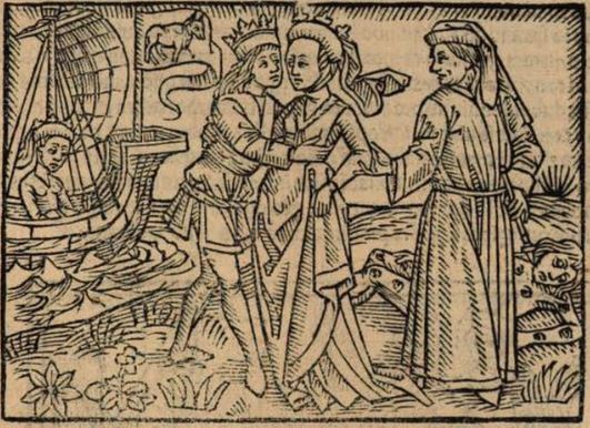 Argia, the daughter of King Adrastus of Argos, is depicted on the right side of the engraving holding the dead body of her husband, King Polynices of Thebes. Boccaccio explains that Polynices had fought in a war against his brother Eteocles and died on the battlefield. Argia snuck herself onto the battlefield after the war to see her husband’s body. She is depicted holding up his lifeless body and hugging it. The left side of the image depicts the other men who had fought and died in this war. There is one man who is presumably wounded and is crawling on his hands and knees. There is a camp with tents set up in the background on the right side and the city of Thebes on the left. Boccaccio believes her to be praiseworthy as it took courage to risk her life in order to find her husband on the battlefield.