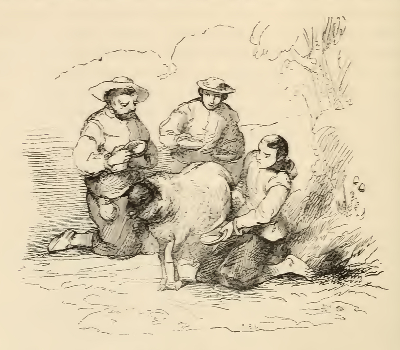 Sancho Panza (left) falls to his knees to beg a little milk of some shepherds who were milking their ewe, a wooden bowl in his hand to keep the milk. In the middle, behind the ewe, a shepherd holds a wooden bowl in either hand to hold milk in, meanwhile, on the right a hatless shepherd grabs the ewe's hind leg and milks the creature, filling his wooden bowl with the lactose.