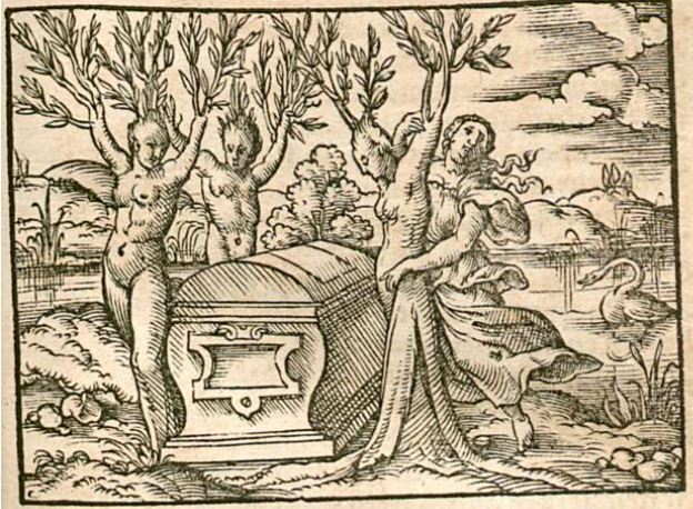 This engraving depicts the three sisters of Phaethon, the Heliades, transforming into poplar trees. The sisters had just learned of the death of their brother and are illustrated standing around his tomb. When they begin to mourn for his death, the sisters notice that their legs have stiffened and begin turning into trunks of trees and their arms into branches. The Heliades’ mother, Clymene, is depicted fearfully clinging onto one of the sisters to stop the transformation from happening. Another relative that deeply grieved for Phaethon was Cycnus. He too had a transformation after hearing the news of Phaethon's death, but instead of a poplar tree like the Heliades, Cycnus transformed into a swan. Cycnus in the form of a swan is illustrated in the background of the engraving, resting on the water.