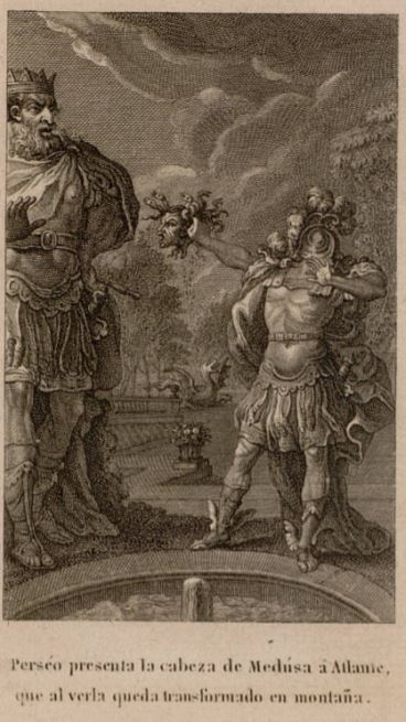 This image depicts the demi-god Perseus on the right side of the image presenting the head of Medusa to Atlas, who is standing on the left side of the image. Perseus is holding out Medusa’s head with his right arm and he uses his left arm to shield his own face away to avoid looking into Medusa’s eyes. Atlas is depicted holding out his hands and has a shocked expression on his face. When people look into Medusa’s eyes they turn to stone, however, Atlas is so large and strong that when he looks at Medusa’s head he turns into a mountain. Years ago, Atlas was given a prophecy that predicted a man born of Zeus would steal the apples off his trees, so in order to protect them from Perseus, he erected a high wall made of stone and forced a serpent to guard the entrance to the orchard. The serpent is illustrated in the background of the image.