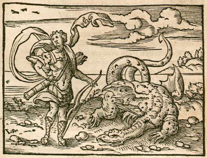 This image illustrates the archer god, Apollo (also referred to as Phoebus), in the foreground of the image holding his quiver in his right hand and his bow in his left hand. Apollo has a face riddled with pride, as he had just slayed the great snake that lays beside him. His arrow is shown in the neck of the serpent. This serpent was created from the new mud of the earth, and when Phoebus slayed the python, the Pythian games were then created to honour this glorious kill done by the god.