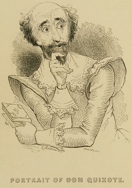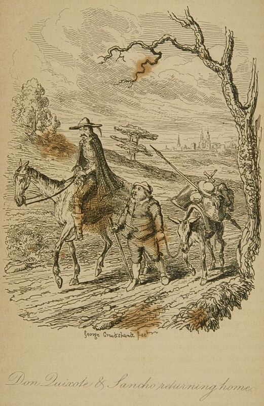 Don Quixote and Sancho Panza make their way home from Barcelona (pictured in the background). Don Quixote is mounted on Rocinante and is no longer wearing his armour. Sancho Panza’s donkey carries Don Quixote’s armour and lance. Signed by G. Cruikshank (illustrator and engraver). Part 2, ch. 66.