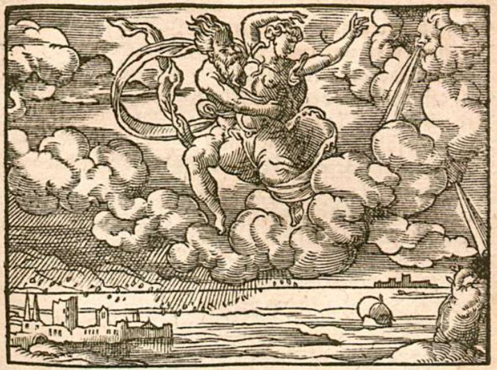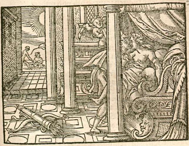 This engraving illustrates the sun god, Phoebus, having sexual intercourse with Leucothoë, the daughter of Orchamus, king of Assyria. The goddess Venus had cursed Phoebus to fall madly in love with Leucothoë as a punishment for humiliating her. Phoebus had disguised himself as Leucothoë’s mother and commanded the slaves to leave the room. The slaves are illustrated in the background of the engraving through a doorway. Once the god was alone with Leucothoë, he showed her his true godly form and proceeded to have sex with her. Phoebus’ is the also the god of archery and his bow and arrows are depicted lying on the ground on the left side of the engraving. Leucothoë is depicted lying on her bed topless with Phoebus kissing her. The god is difficult to see in the image as he is directly behind a column. Leucothoë’s father had her buried alive after her encounter with Phoebus. She subsequently transformed into an incense plant while underground.