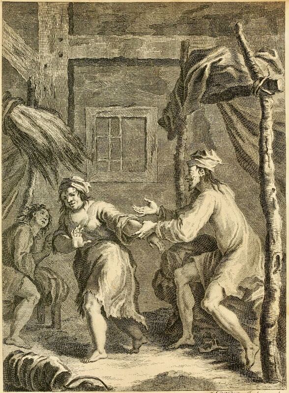 In the foreground, the housekeeper and the niece prevent Sancho Panza from entering the house and visiting Don Quixote. In the background, the barber and the priest hear Sancho’s shouts and appear in the doorway of the house. Unsigned. Part 1, ch. 3.