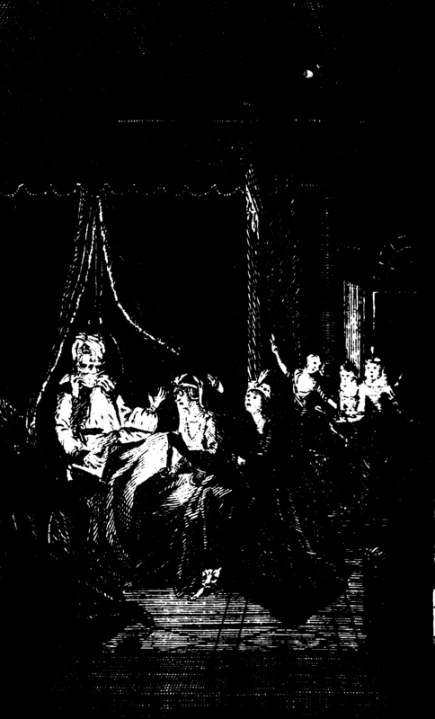 Due to an unfortunate run-in with a cat, Don Quixote is confined to his apartment for six days. Lying awake in bed, he is visited by Donna Rodriguez, the Duchess' woman. To heal his wounds, Quixote wrapped himself from head to foot in a yellow satin quilt , with a woolen cap on his head, his face and his moustache bound up; his face was bound to heal his scratches, and his moustache to keep from hanging down and looking silly. Donna Rodriguez approached Quixote in a white veil, that covered her from head to foot. In her right hand she carried a lighted candle , and held her left hand before her face to keep the blaze of the flame from her eyes, which were hidden by a huge pair of spectacles. Donna Rodriguez regales Quixote with the story of how she came to work as a servant for the Duchess despite having been born a noble. However, they are interrupted by unknown assailants who barge into the room to punish Quixote and Rodriguez.