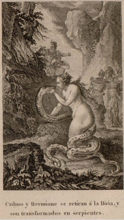 This image depicts Cadmus, the king of Thebes, transformed into a snake. His wife Harmonia is depicted holding him while she wishes to be transformed into a snake as well in order to be with him. Cadmus was transformed into a snake as punishment for slaying a serpent sacred to the god Mars. There are soldiers in the background of the image watching the scene unfold.