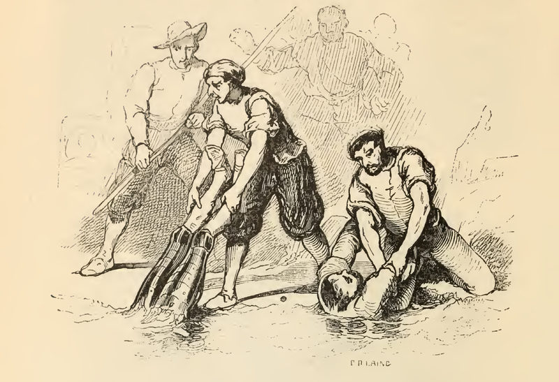 Having capsized Quixote's boat, two millers pull the drenched passengers from the river. The miller on the right pulls Sancho Panza's arm whilst kneeling on the bank, his sleeves rolled up past his elbows. Sancho grasps for air as he surfaces, his hands reaching for something solid to hold. On the left another miller pulls Don Quixote from the river by his ankles, the knight's leg armor is all that's visible to identify him with. In the background to the left a third miller looks at Quixote's lower half combatively with a wooden pole in hand, and two more figures in the middle of the background approach the newly submerged men.
